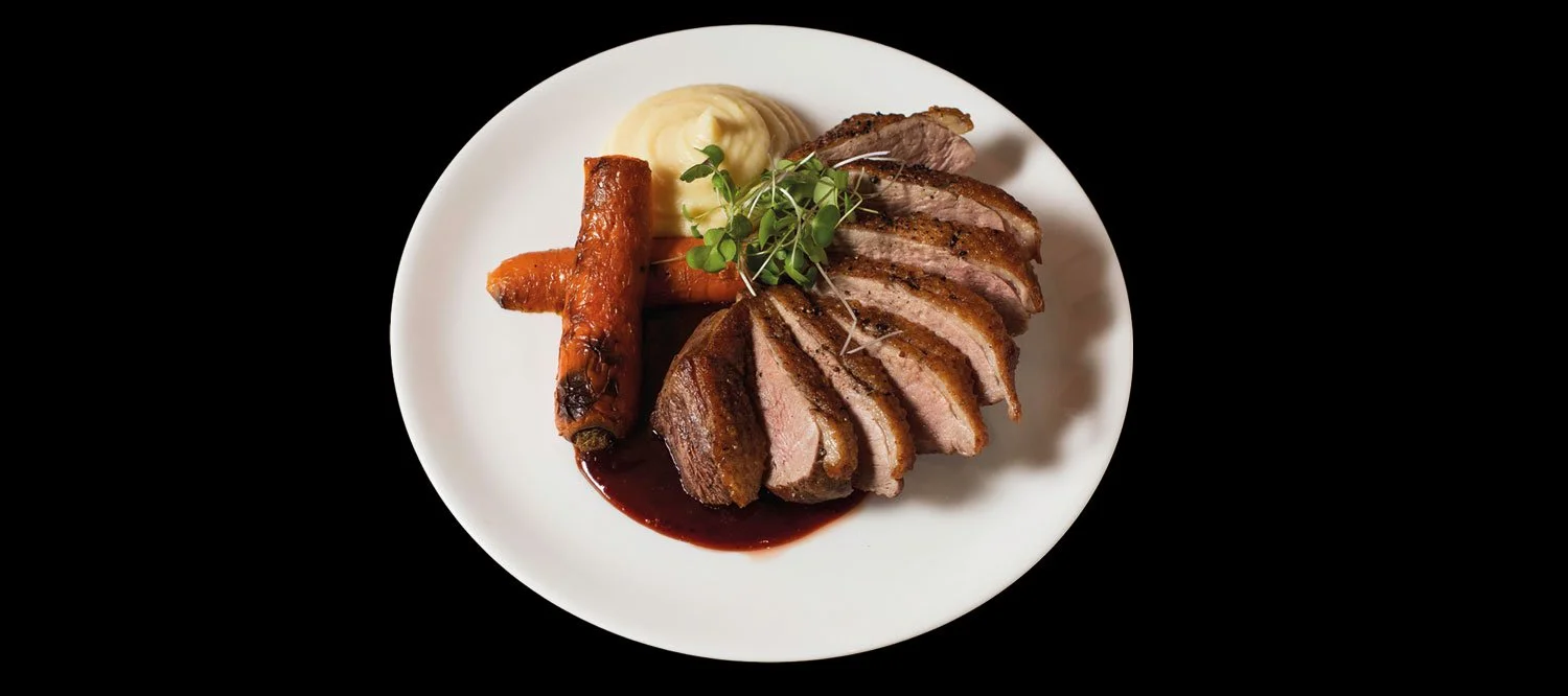 Roseeksi kypsennetty ankanrinta, mustaherukkakastike ja samettinen juuripersiljapyree (L, G)